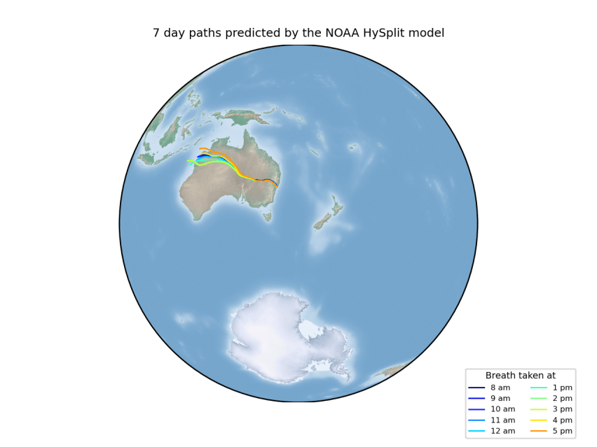 Data collected from each exhibition is being used in the You Are Here project to consider the question “If we could track the air from each captured breath as it was carried by the wind around the world, where is it now?”. Scientific modelling software for tracking air developed by the US NOAA organisation is being applied to this question.