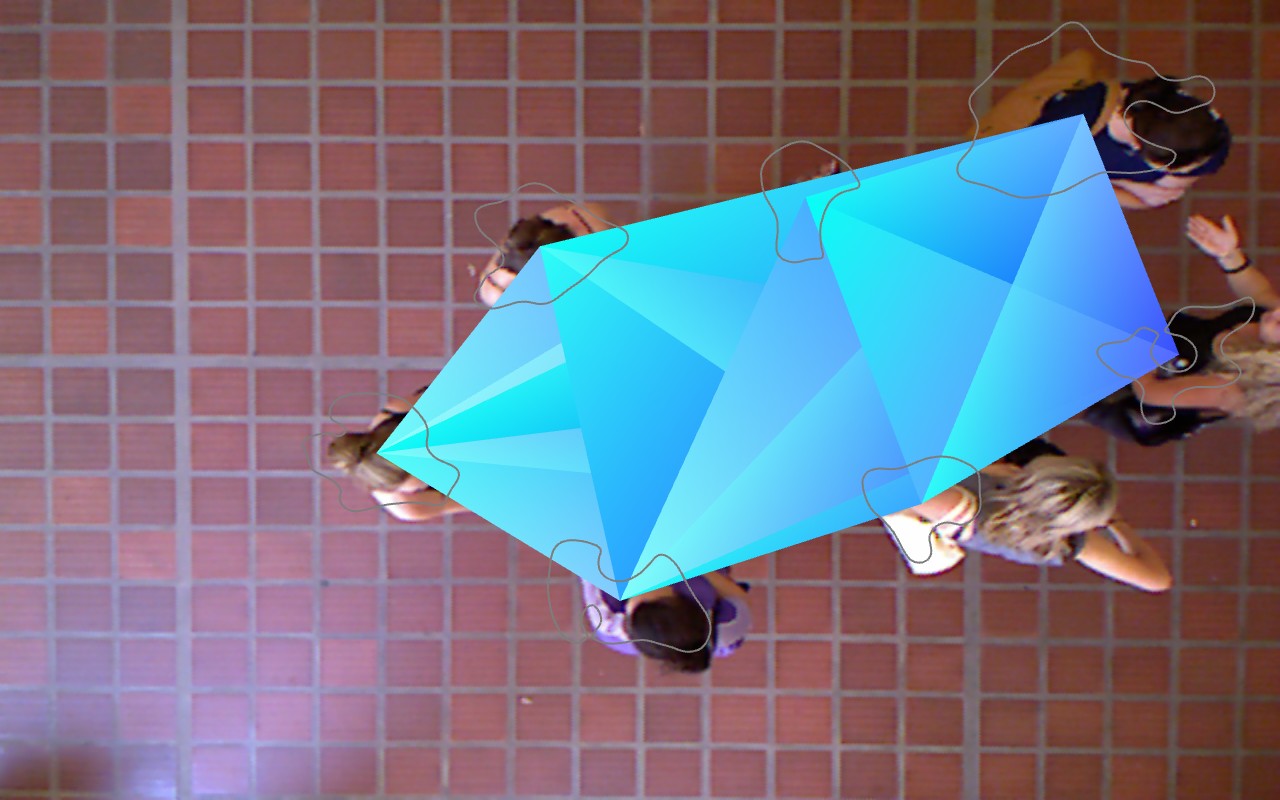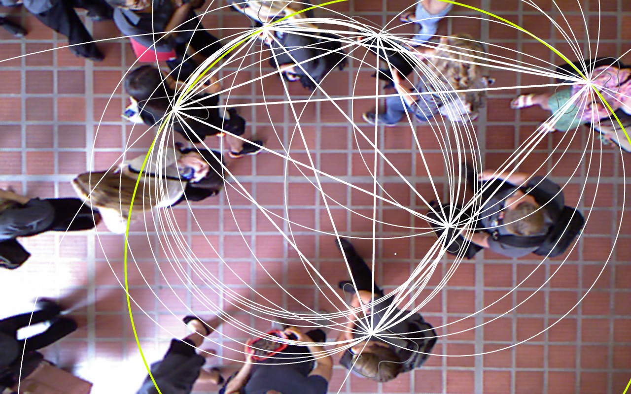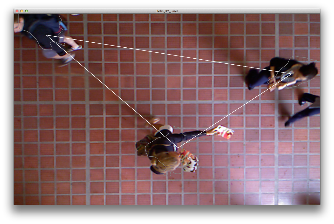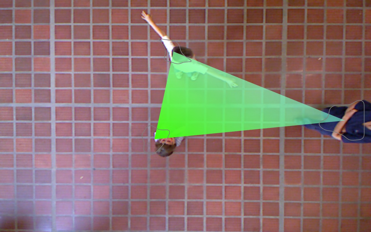 The visual representation of the connection between people has taken three forms so far: simple lines connecting every recognisable person in the scene; lines with circles through sets of three people; and coloured triangles joining each set of three people. The objective of these variations is to encourage collaborative play. Insufficient time has been spent on observing group behaviour to determine how effective this has been.