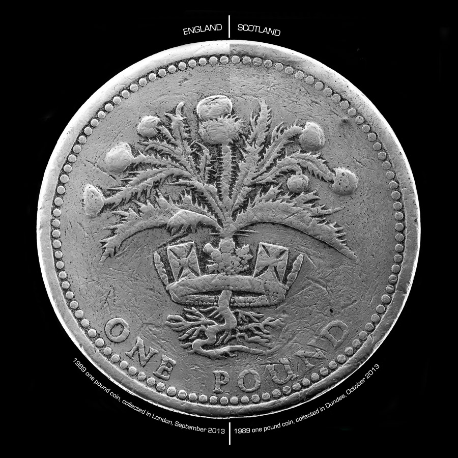 As an outsider and a visitor to Scotland for 4 months in late 2013 it appeared to me that the public discussion over the pros and cons was solely based on economic grounds. In talking to the people of Scotland it was clear that the real issues run much deeper and touch on patriotism, culture, identity and history. This work takes coins from England and Scotland – symbols of both the economic debate and the union itself – and looks at them more closely for the signs of the human side to the discussion left through the marks of the many citizens of the United Kingdom who have handled them.