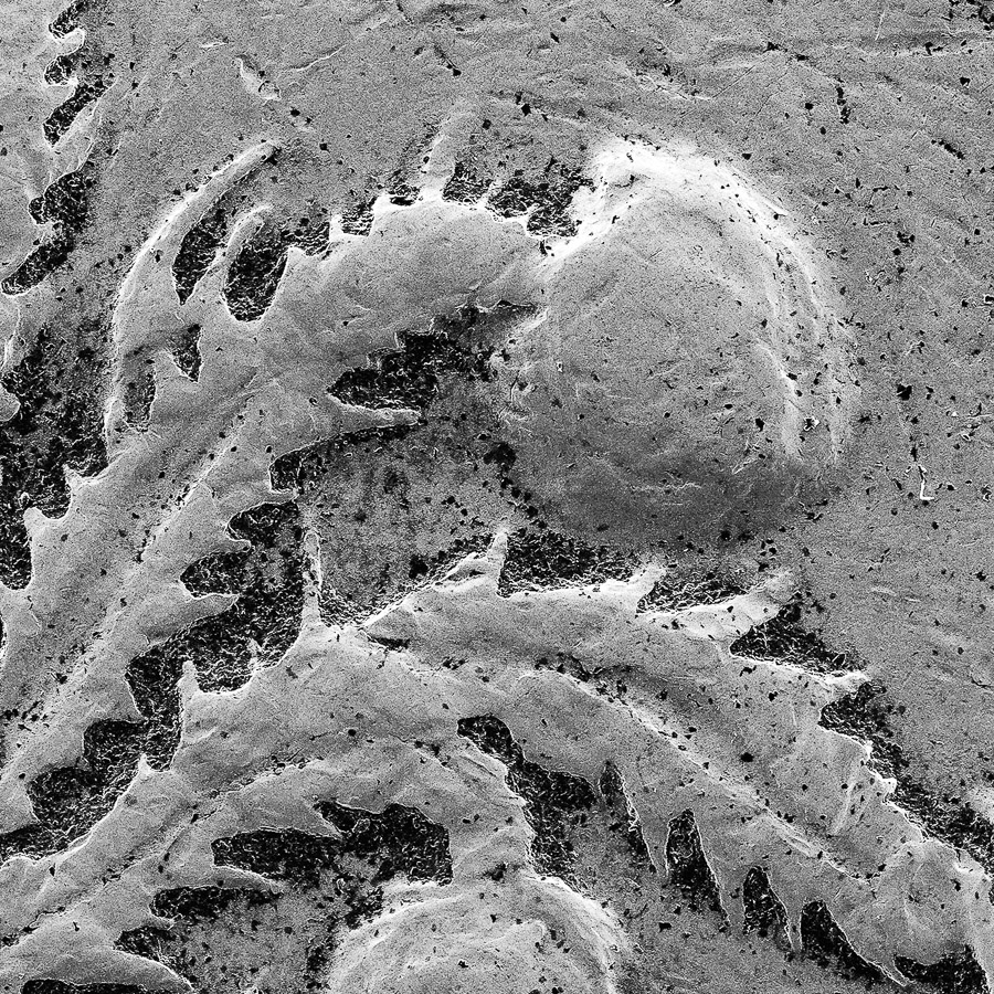 Each image is constructed from over one hundred scanning electron microscope images of two 1989 one pound coins – one collected in London, England and the other in Dundee, Scotland. The images were produced with the assistance of the College of Life Sciences, Dundee University.