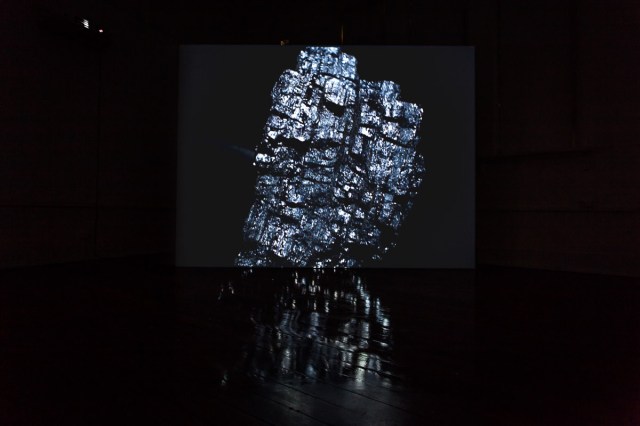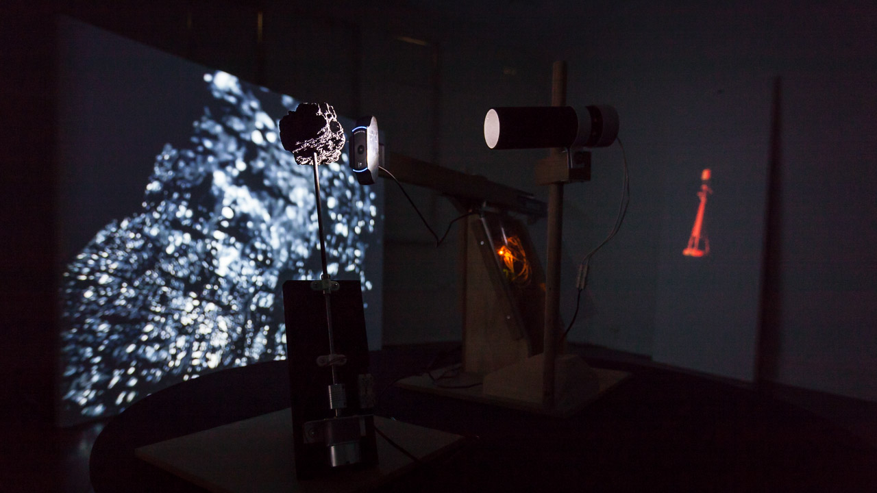The installation The Bell Buoy explores this idea. While the approaching asteroid of disaster-movie fiction becomes a metaphor for the imminent climate catastrophe, its source in physical reality, the spinning fragment of fossil fuel, draws a parallel with our hyperreal world. The lone, silent buoy is an impotent warning of the danger. As Rudyard Kipling’s poem The Bell Buoy heralds, “By the gates of doom I sing, On the horns of death I ride.”