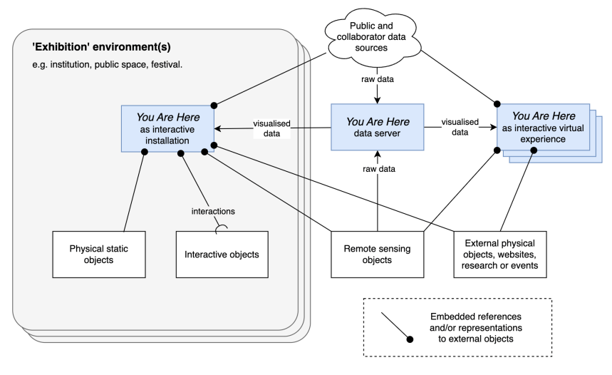 1. The development of a prototype data server (see following diagram) that will interpret, store and serve, in real-time, re-formatted data from public and collaborator data sources and remote sensors for use by distributed instances of the You Are Here installation.
